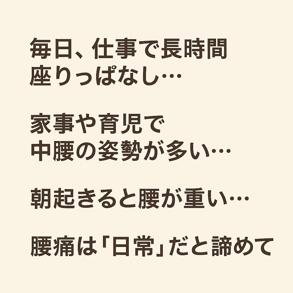 「毎日、仕事で長時間座りっぱなし…」「家事や育児で中腰の姿勢が多い…」「朝起きると腰が重い…」 仕事や家事、そして育児など、毎日の生活には腰に負担がかかるシーンが満載です。腰痛は「日常」だと諦めていませんか? 辛い痛みを我慢し続けることは、心にも体にも大きな負担をかけてしまいます。